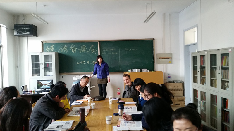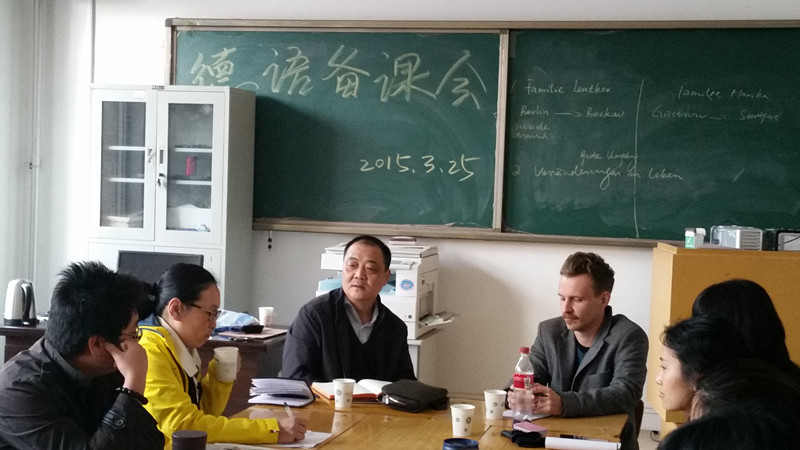会议由德语教学部主任陈丹宇主持。备课会每周三下午召开,每次由一至两名德语教师担任主讲。按照顺序,今天的主讲是赵娜老师,其余德语老师为学生。赵娜从“Familie leuther”开始讲起,全德语授课,“同学们”都认真听讲并积极回答问题,德国口语外教也忍不住加入了讨论行列。整个课堂互动效果良好。