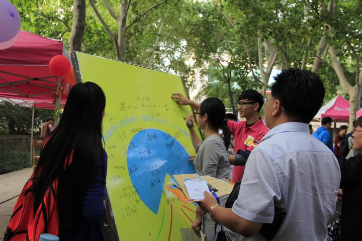 新生在签名板上留下新学期的心愿,如果说国交是一个圆,是你们的到来使这个圆完整了。