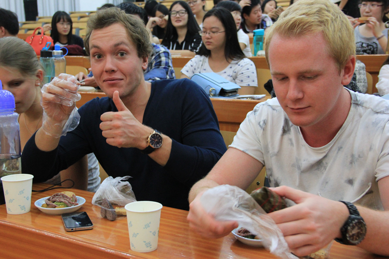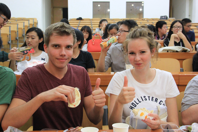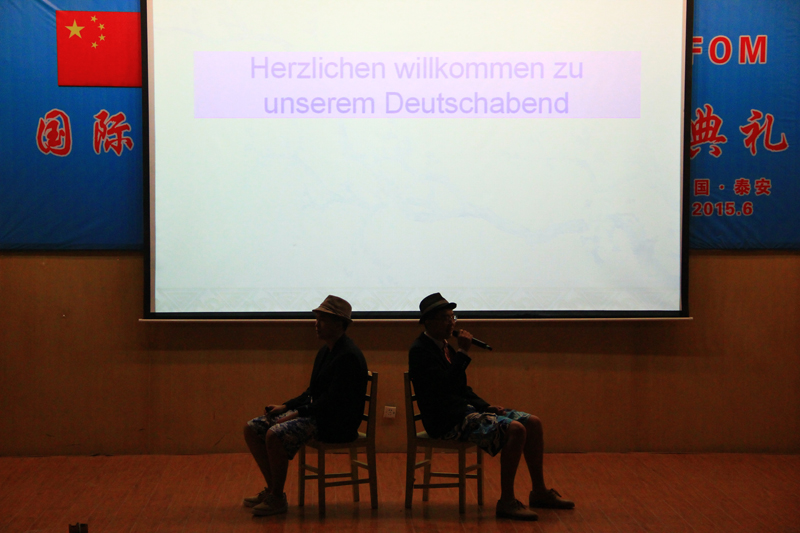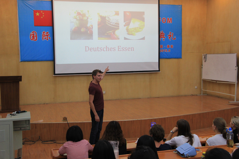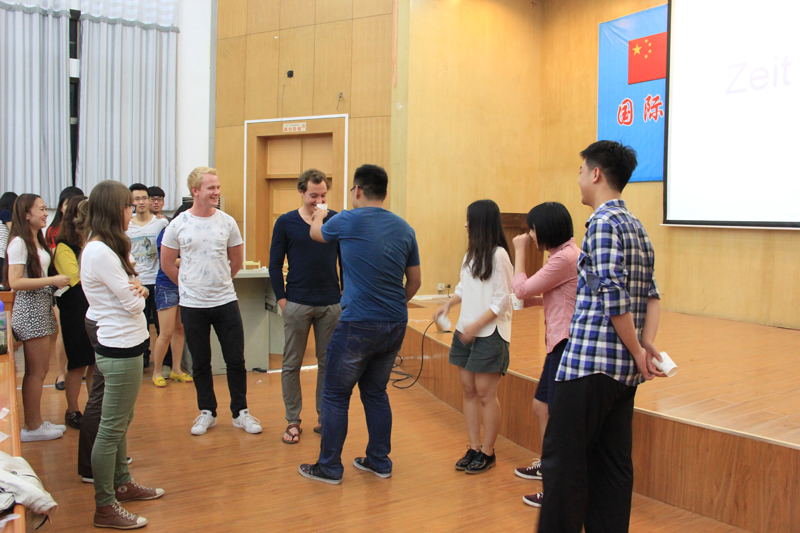 本次活动以“Essen”(吃)为主题,在传统的中秋佳节来临之际,共同探讨中德两国不同的饮食文化。德语之夜以一首节奏欢快的德语歌拉开序幕。首先,由学生代表介绍了传统的中秋团圆节,还有特色饮食——月饼及其来历。之后,各位小教也毫不输阵,逐一介绍了别具德国风味的早餐及特色甜点等,其间小教与同学们互动不断、笑语连连。经过精彩的互动游戏“猜饮料”与“抢板凳”后,又向小教们现场展示了丰富多彩的中国美食,并与他们一同品尝,交流心得。