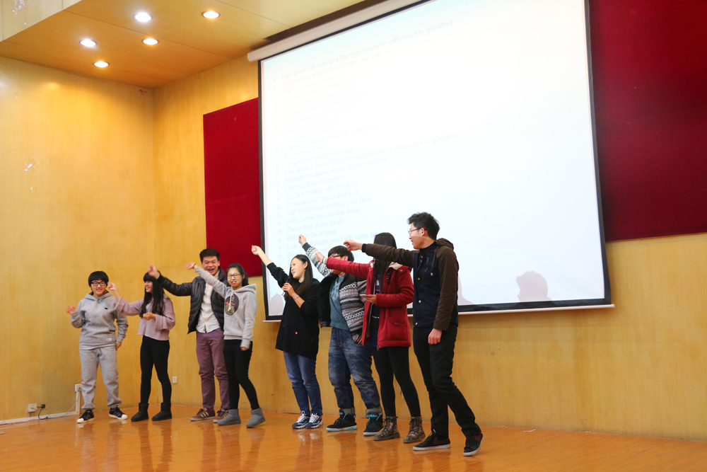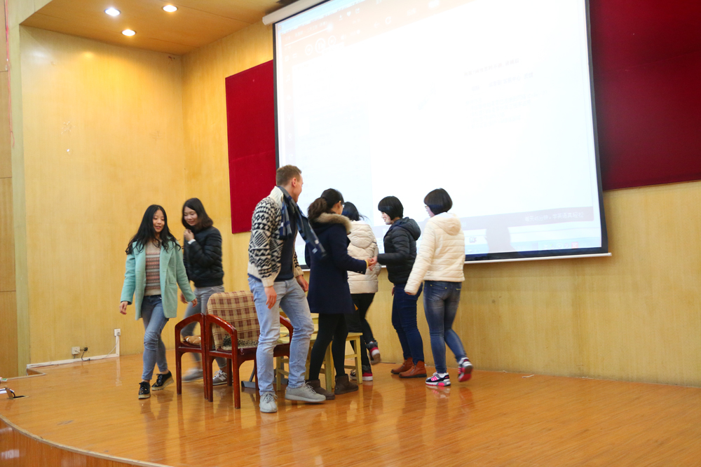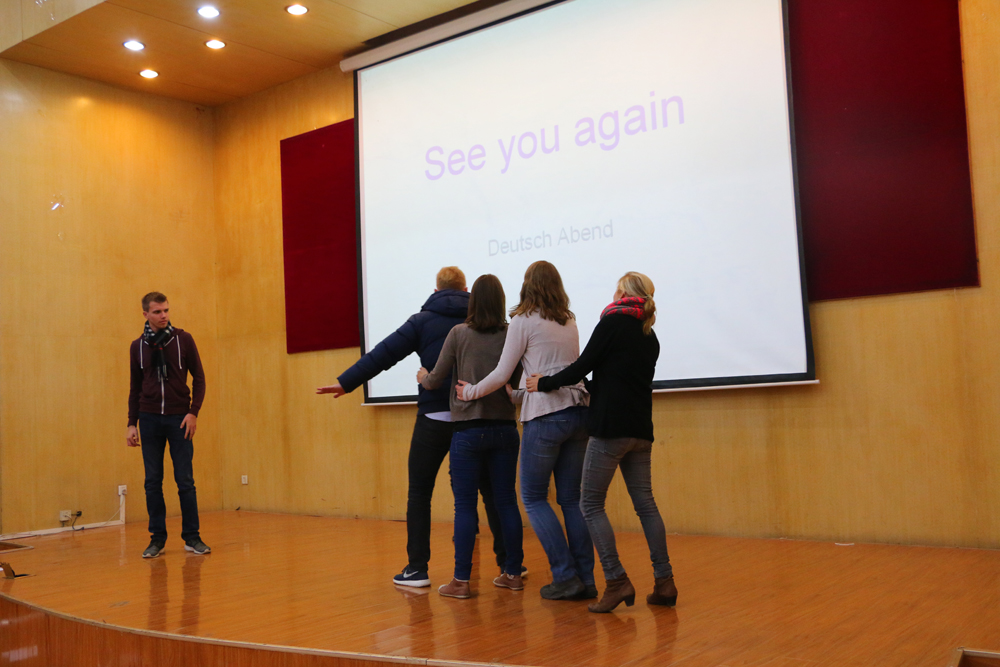 伴随着欢快的音乐,本次德语角活动也正式开始。首先播放了为小教们精心准备的视频,视频中皆是这四个月来小教们的日常照片,期间也不乏同学们的身影。这同时也反应了同学们与小教们浓厚的友谊。接下来又进入了愉悦的游戏时间,同学们与小教们进行了踩报纸、老鹰捉小鸡、抢板凳等中国的传统游戏,同学们与小教们的笑声交织在一起,共同体验了中国传统游戏的魅力。最后,由同学代表发言,表达了对小教们的衷心感谢以及对小教们的美好祝愿。一曲《再见》承载了四个月来的欢声笑语,唱出了声音却唱不出同学们心中的感情与思念。