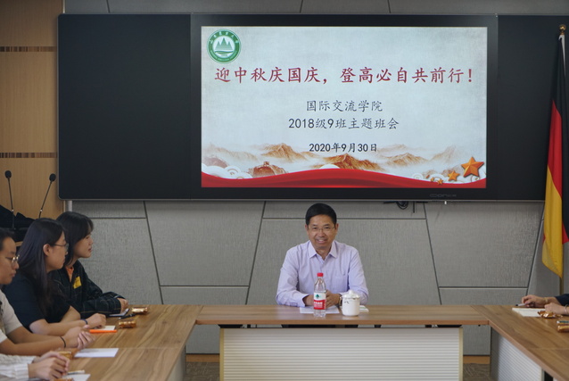 9月30日上午,国际交流学院2018级9班班主任张宪省校长以“迎中秋庆国庆,登高必自共前行”为主题在学院402召开班会。