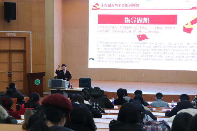 在接下来的党课中,宋洁从十九届五中全会公报、14个关键词、规划《建议》三个方面对十九届五中全会精神进行了解读,介绍了十九届五中全会的基本情况与指导思想。随后,她对全会公报中的“决胜全面建成小康社会取得的10方面决定性成就”等方面分别展开解读。“十三五”时期,在党的领导下,脱贫攻坚粮食产量、城镇就业、基本医疗保险与养老保险等取得显著成效。接下来,宋洁还对“十四五”规划与“到二〇三五年要实现的9方面愿景目标”两部分进行了仔细讲解。