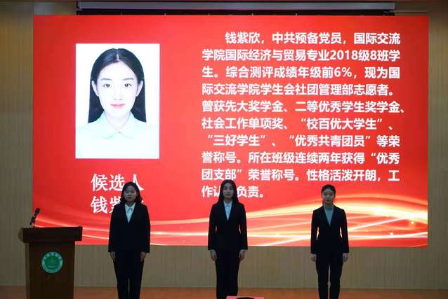 大会选举产生学院第十六届主席团和学校学代会代表,确定孙睿思、钱紫欣2人当选为第16届学生会组织主席团成员;孙睿思、钱紫欣、刘一萍、周若琦、程娜仁图雅、张雯涛、王虔、刘逸飞、窦俊9位同学为上级学生组织代表大会代表,代表兼顾男女、少数民族、非校院学生会组织骨干。