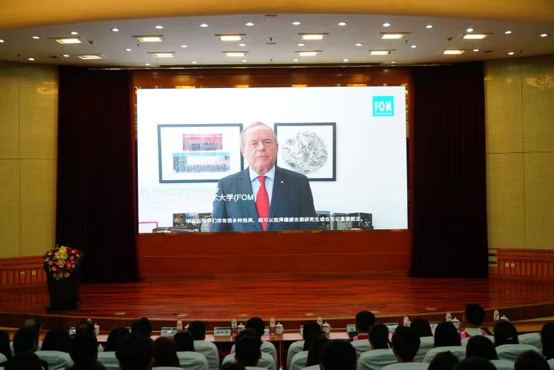 德国FOM大学行政校长白潇乐博士也通过录制视频的形式为2021届毕业生送来了最真挚的祝福。白潇乐博士肯定了中德之间深厚的友谊及山东农业大学和FOM大学的互相信任,由于疫情,2017级中只有少数同学赴德学习,但FOM大学的导师教授依然通过线上学习的方式帮助同学们圆满完成学业,这是中德双方师生高度配合的成果。他强调,随着中德两国贸易往来日益密切,希望同学们作为经济精英为中德双方的经济建设和友好往来做出贡献。
