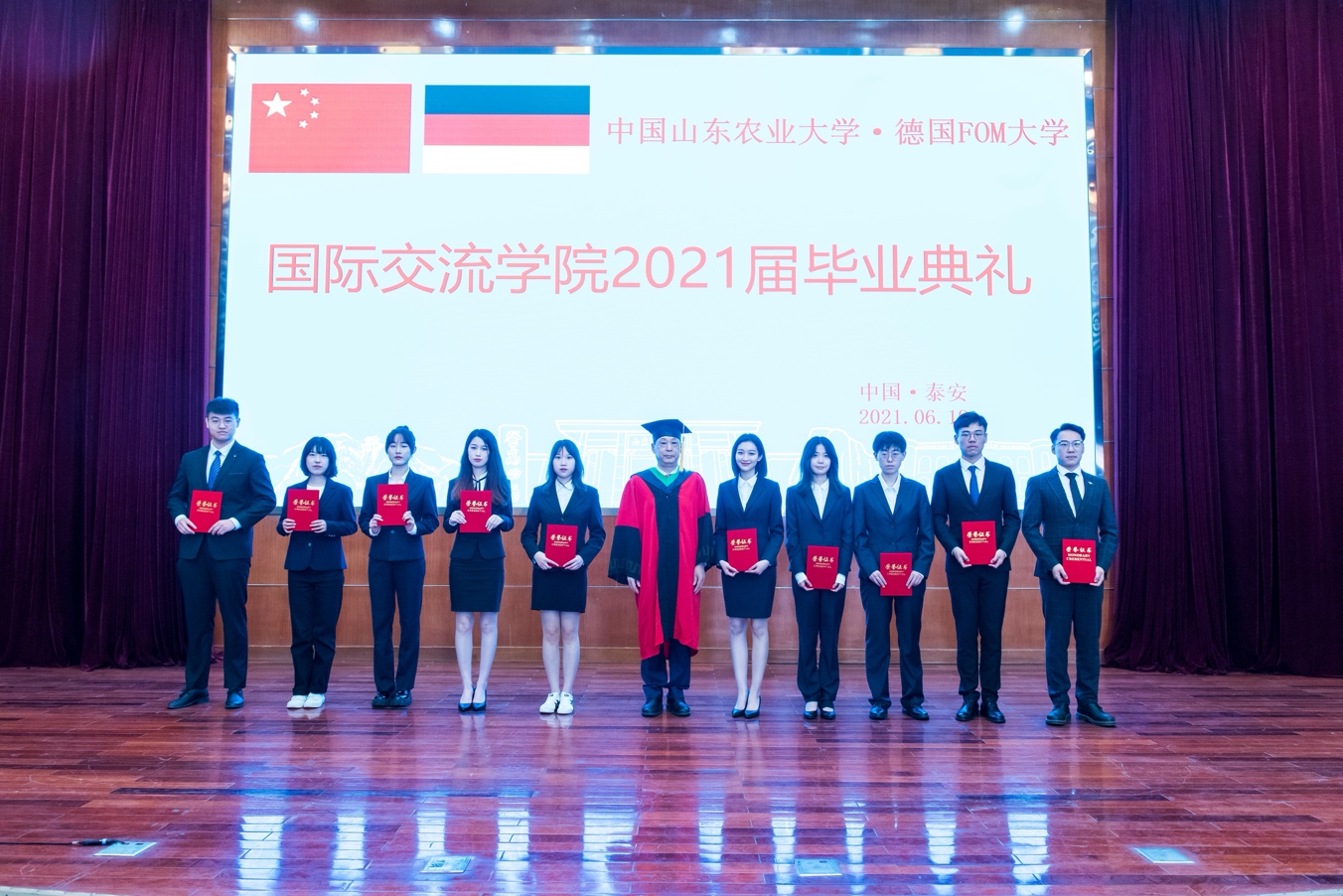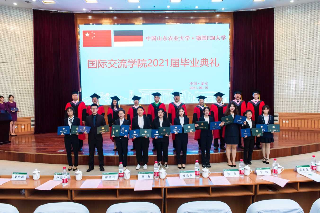 6月19日上午,国际交流学院2021届毕业典礼在文理大楼学术报告厅举行。山东农业大学副校长、泰山学者、博士生导师林海教授,机构联合管理委员会成员单位代表,德国FOM大学驻学院代表,国际交流学院领导班子、学院全体教师出席典礼,2020级全体学生列席观礼。