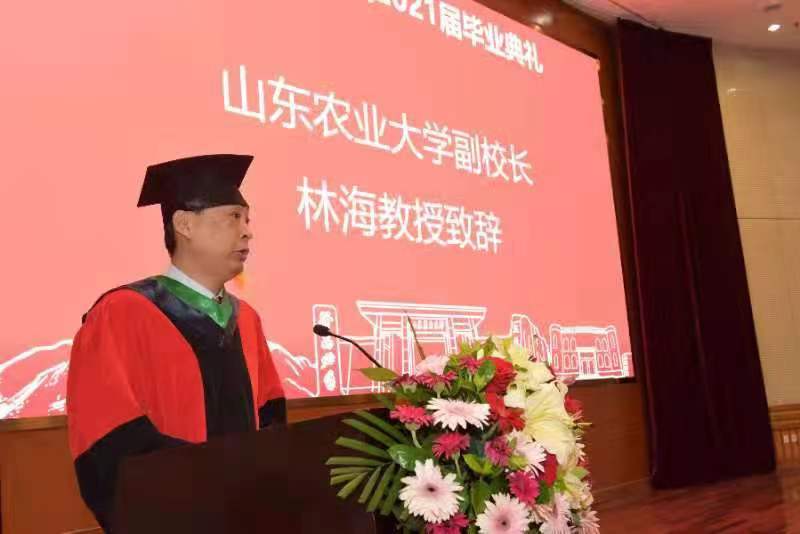 毕业典礼在庄严肃穆的国歌声中正式拉开序幕。副校长林海致辞,代表山东农业大学全体师生为毕业生送上最衷心的祝福,作为师长,他和同学们分享了三个词:自信、包容、律己,叮嘱同学们要以“自信”立身,以“包容”处世,以“律己”修德,树立正确的价值观,坚定内心,坚守底线。林海强调,今年,恰逢中国共产党成立100周年,全国上下党史学习教育正在深入开展,站在两个100年的伟大历史交汇上,同学们躬逢其盛,却也重任在肩,大家既是第一个百年目标的共享者,更是第二个百年目标的生力军, 希望同学们永远秉承‘登高必自’的校训,发扬山东农业大学学子艰苦奋斗、勇于拼搏的精神,积极开拓进取,在未来的人生道路上绽放光芒,活出精彩,成为山农的骄傲。