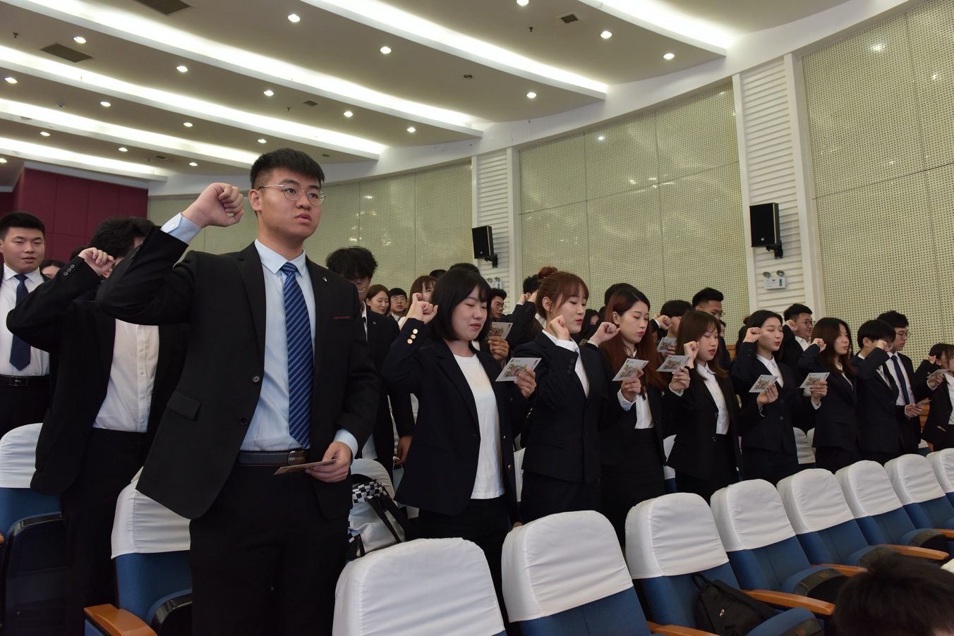 典礼上毕业生代表程志涛也代表国际交流学院2021届全体毕业生表达了对母校和老师四年培育之恩的由衷感谢,表达了同学们定不负众望,砥砺前行的决心。随后他带领全体毕业生进行毕业宣誓。铿锵有力的誓词是同学们心照不宣的写照,同学们的声音响彻会场,他们用最洪亮的声音来为自己的大学生涯画上圆满的句号。