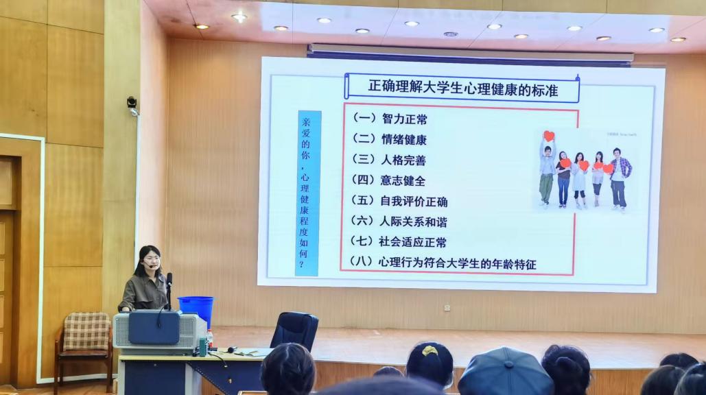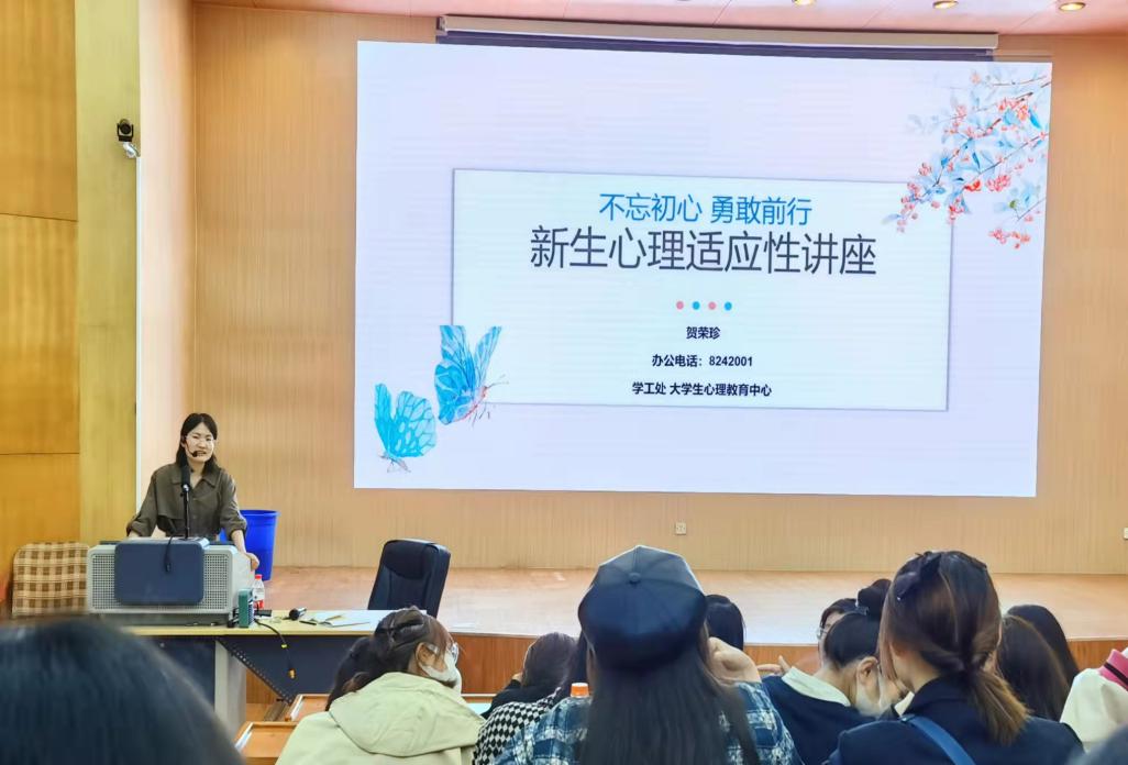 讲座中,贺荣珍老师从心理健康概述、新生常见的心理困惑、新生心理适应和自我管理四个方面分别进行讲解。她首先通过一个有趣的心理测试切入话题,活跃现场气氛,调动同学们的参与热情。随后,贺老师向同学们讲述了心理健康的含义,并针对当代大学生的心理状况及表现,从心理调整、身体调整、学习调整等多个方面分享了从容面对学习生活和实习工作的建议,指导同学们如何正确的发泄压力和管理情绪,达到健康快乐学习成长的目的。她强调,同学们作为新时代的“国际范”青年,要勇于走出“舒适区”,主动跨入“潜力区”,不断尝试新鲜事物,探索未知领域,开拓思维视野,不断激发自身潜力,不负时代重托。最后,贺荣珍老师希望同学们努力培养自己的“思考能力”“抗压能力”“应变能力”和“自控能力”,明确自己的人生规划,用信心拥抱未来,用成就感推动自身的发展,脚踏实地,迎接美好未来。