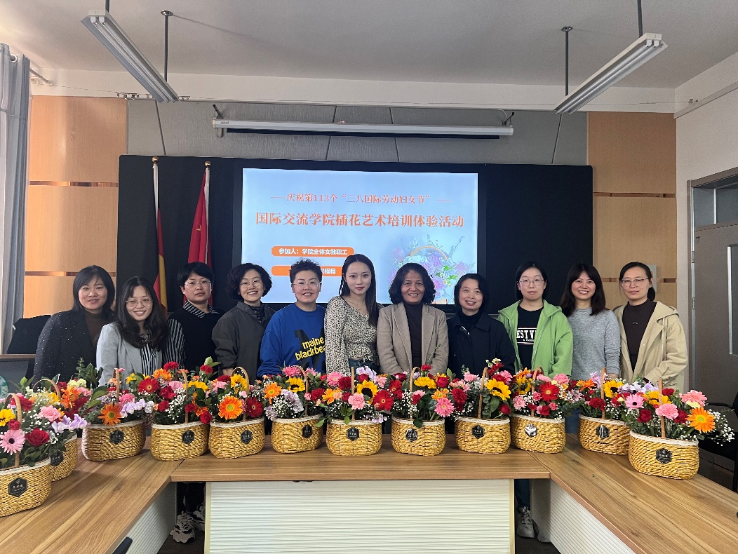 3月9日下午,为庆祝第113个“三八”国际劳动妇女节,国际交流学院在11号楼403会议室举组织学院全体女教职工进行了插花艺术培体验活动。此次活动以“关爱女性教职工,放下工作,回归自然”为主题,旨在放松身心,充盈教职工的课余活动,感受一花一叶的浪漫,以特别的方式为女教职工们献上真诚而温馨的祝福。
