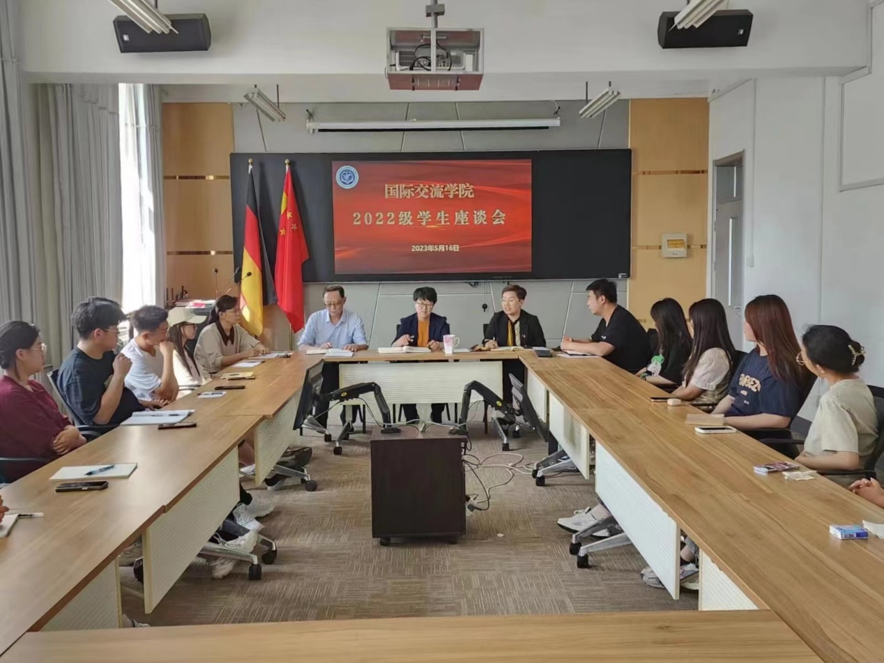 2023年5月16日,国际交流学院在11#403会议室召开2022级新生座谈会,学院党委书记刘甜甜、党委副书记宋洁、教学副院长钟杰、教学秘书、辅导员及2022级各班学生代表参加座谈会。