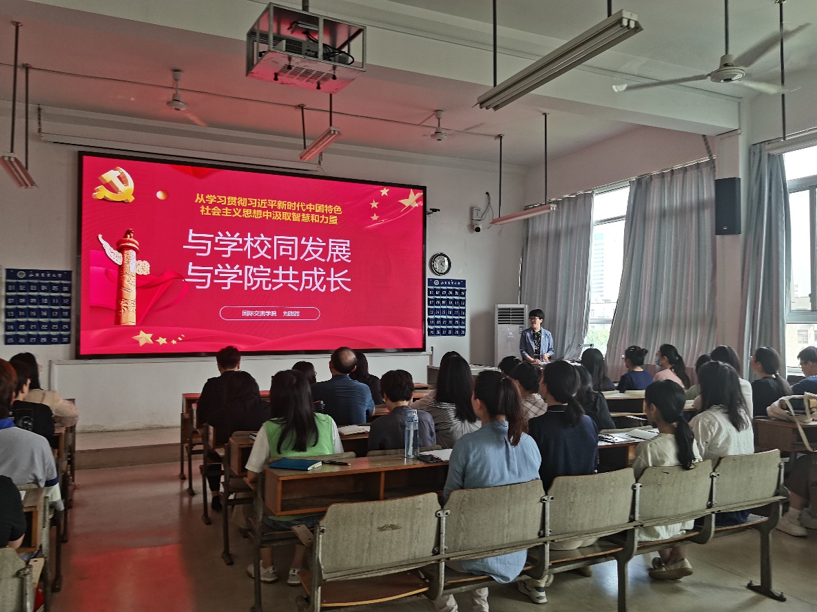 为推进主题教育走深走实,从学习贯彻习近平新时代中国特色社会主义思想中汲取智慧和力量,6月6日下午,国际交流学院党委书记刘甜甜以“与学校同发展,与学院共成长”为题讲授专题党课,学院全体教职工和学生党员参加此次活动。