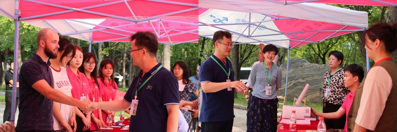 学院党委书记刘甜甜,院长付道林同参与迎新工作的外教、学生志愿者亲切交谈。