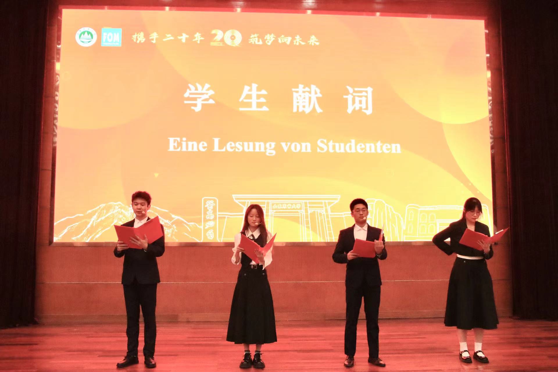 现场活动丰富多彩。学院2008届校友杨奕女士代表校友现场致辞;德国留学校友发来视频表达对母校的祝福;四位国交学子用中德两种语言表演诗朗诵《友谊》,为两校20年的合作献词。