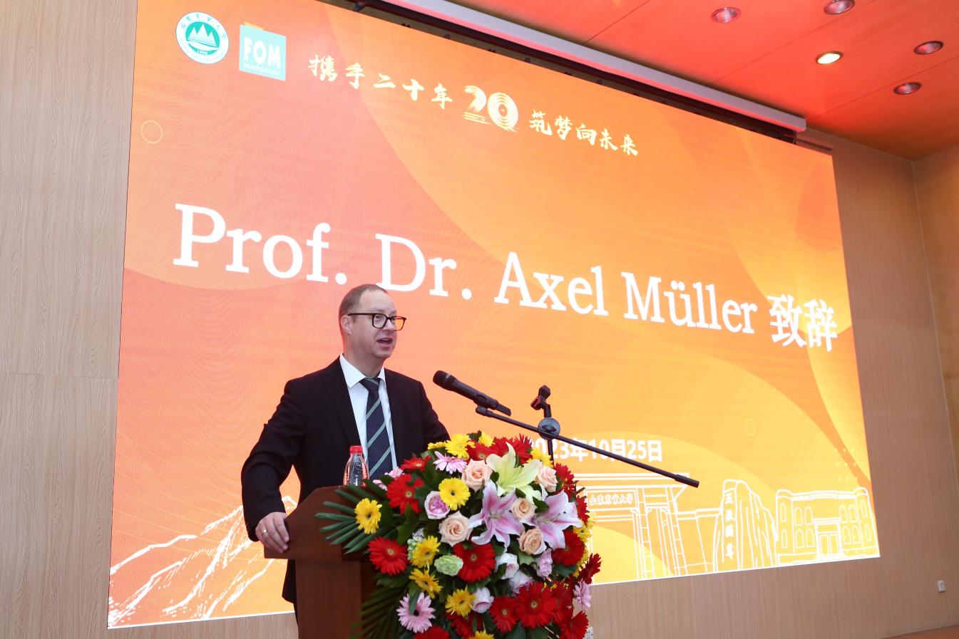 学院院长付道林主持仪式,FOM大学米勒教授为启动仪式致辞。FOM大学德籍教授Alexander Tirpitz做德福泰山讲堂首场学术报告,他以 "工作组织中的趋势还是可持续变革?”为题阐述了经济和文化方面的专业知识。 Tirpitz教授是 FOM大学经济学教授。他曾就读于柏林自由大学并获得博士学位。他不仅拥有出色的学历,而且在学术上孜孜不倦的奉献精神和在企业界出色的实践经验使他走上了一条非凡的道路。