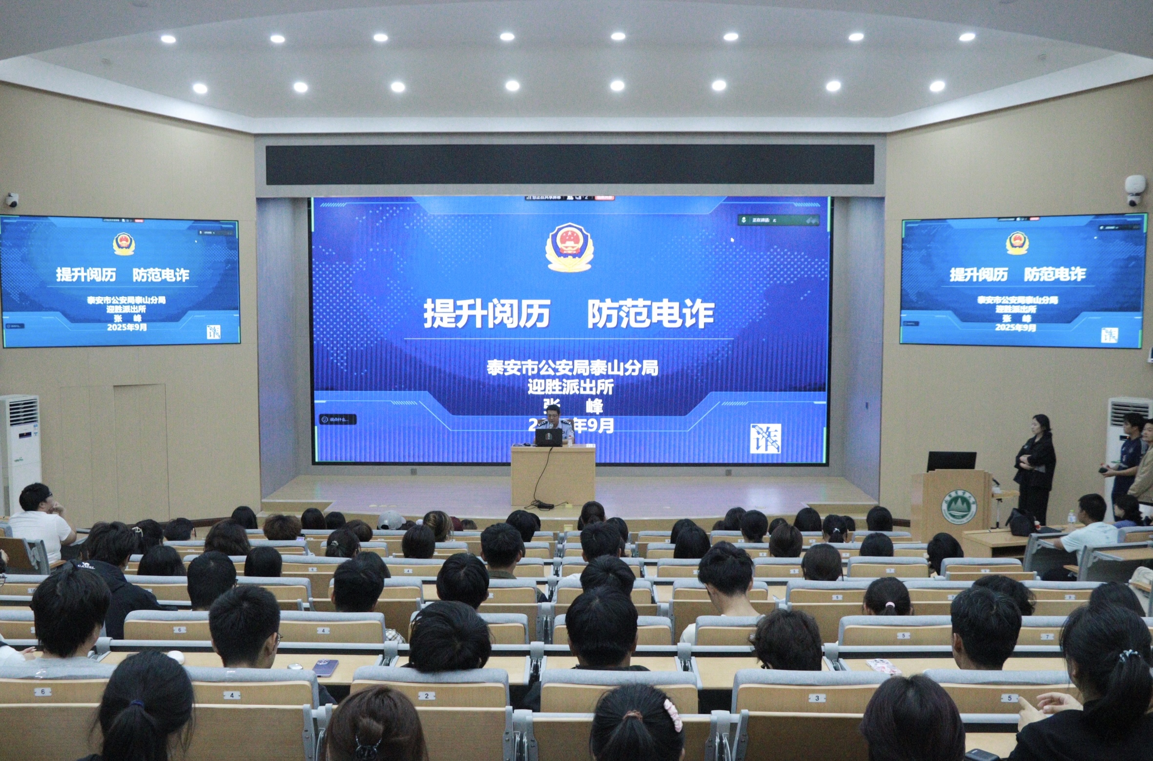 9月26日,国际交流学院特邀泰安市公安局泰山分局迎胜派出所副所长张峰,为全体2025级新生开展电信网络诈骗防范宣讲活动,传递实用反诈知识。