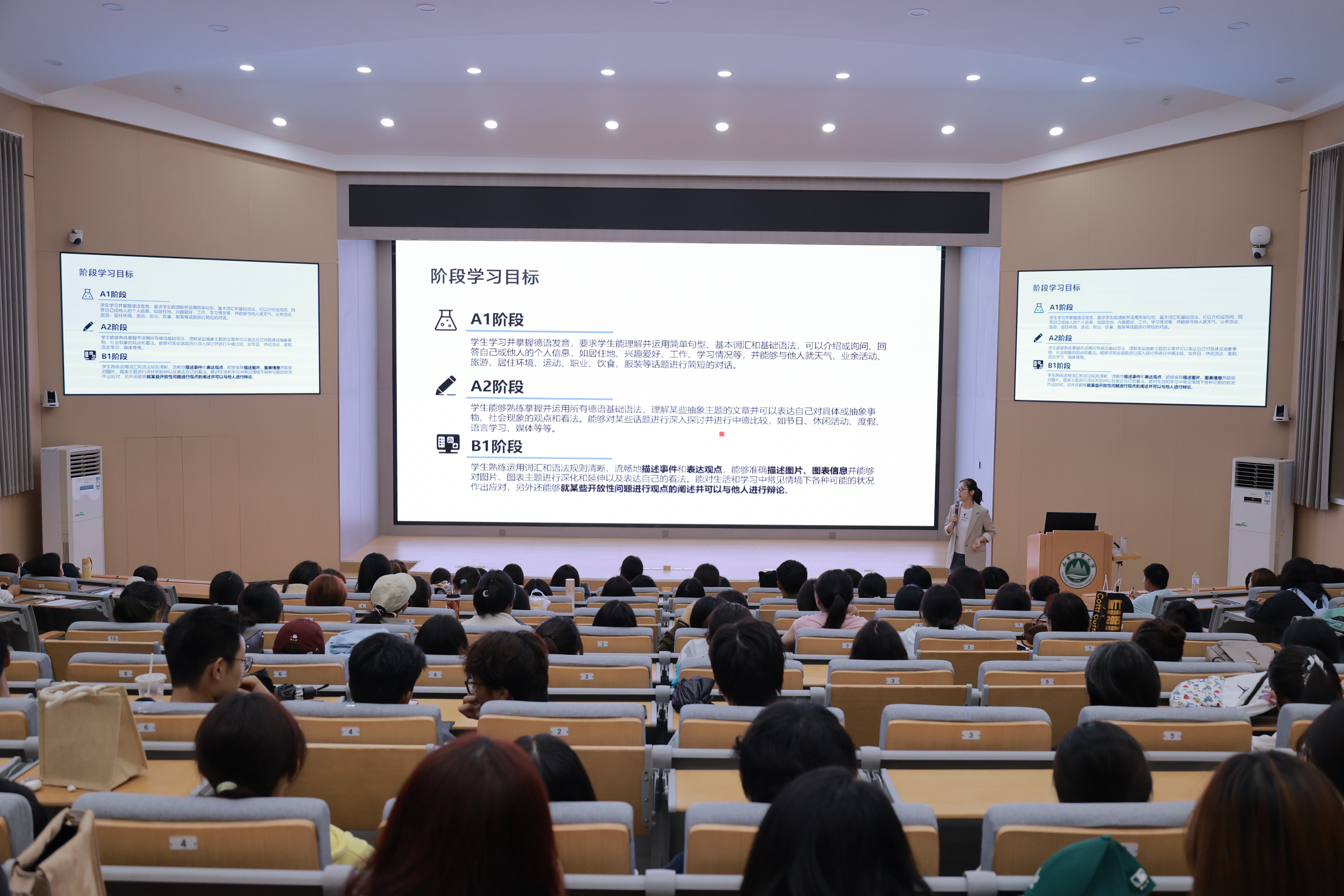 讲座现场,马景辉主任围绕德语学习核心展开分享:系统拆解从A1至B1阶段的学习目标与能力标准,深入解读“4+3”轮换授课机制的独特优势,并重点介绍“课堂三遍式听力训练+课外每日练习”的高效模式,助力新生实现德语知识从“会学”到“会用”的转化。