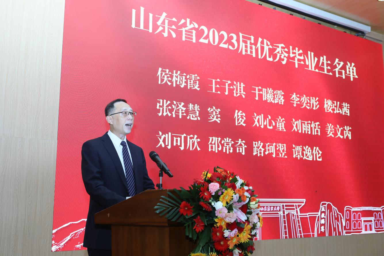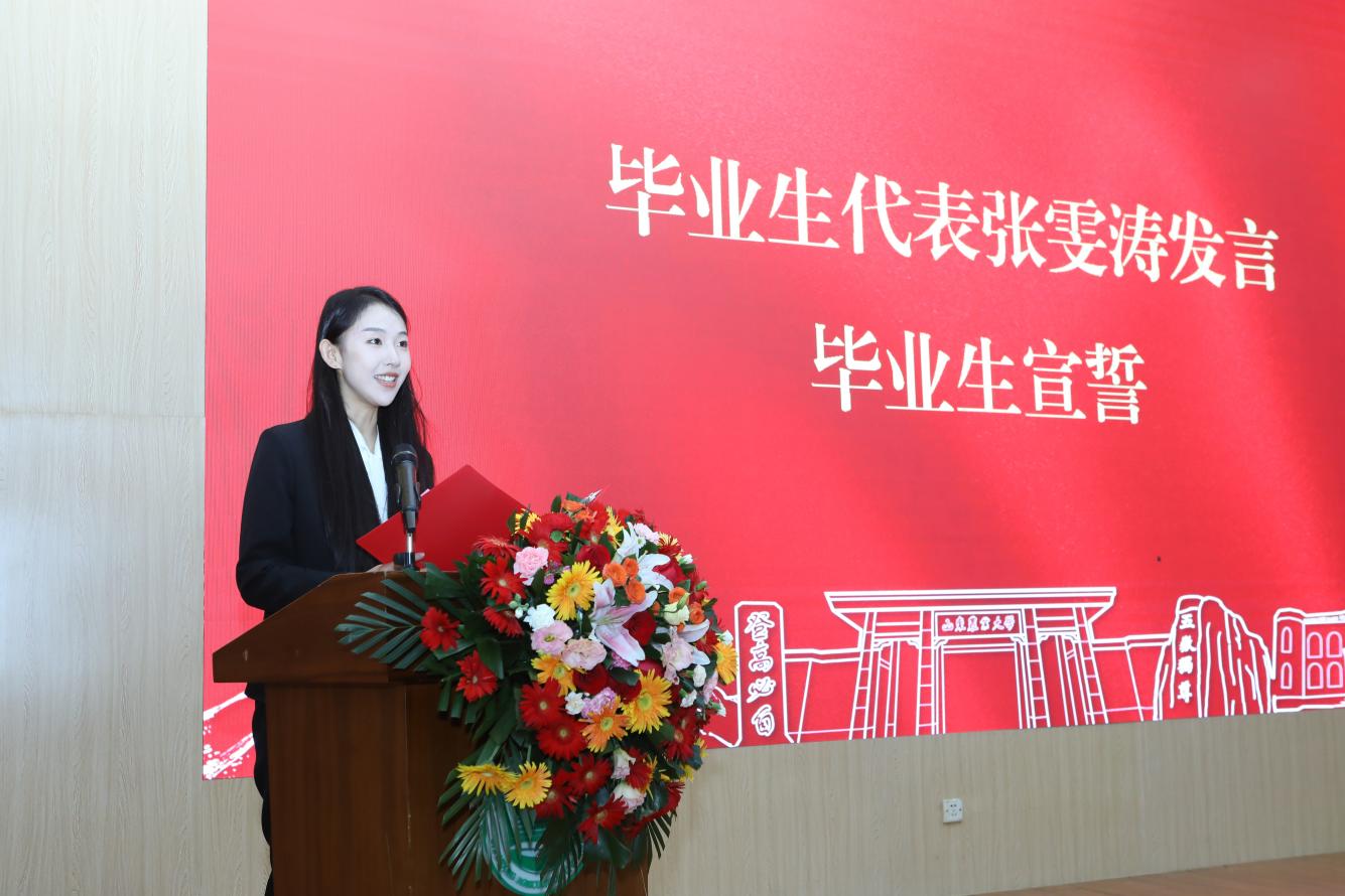 毕业生代表张雯涛代表国际交流学院2023届全体毕业生对母校和学院的悉心培育、老师的辛勤付出表达了由衷的感谢并带领全体毕业生进行了庄严宣誓,在今后的人生中,不畏前路,谨记山农“登高必自”的校训,扎实进取,勇往直前!