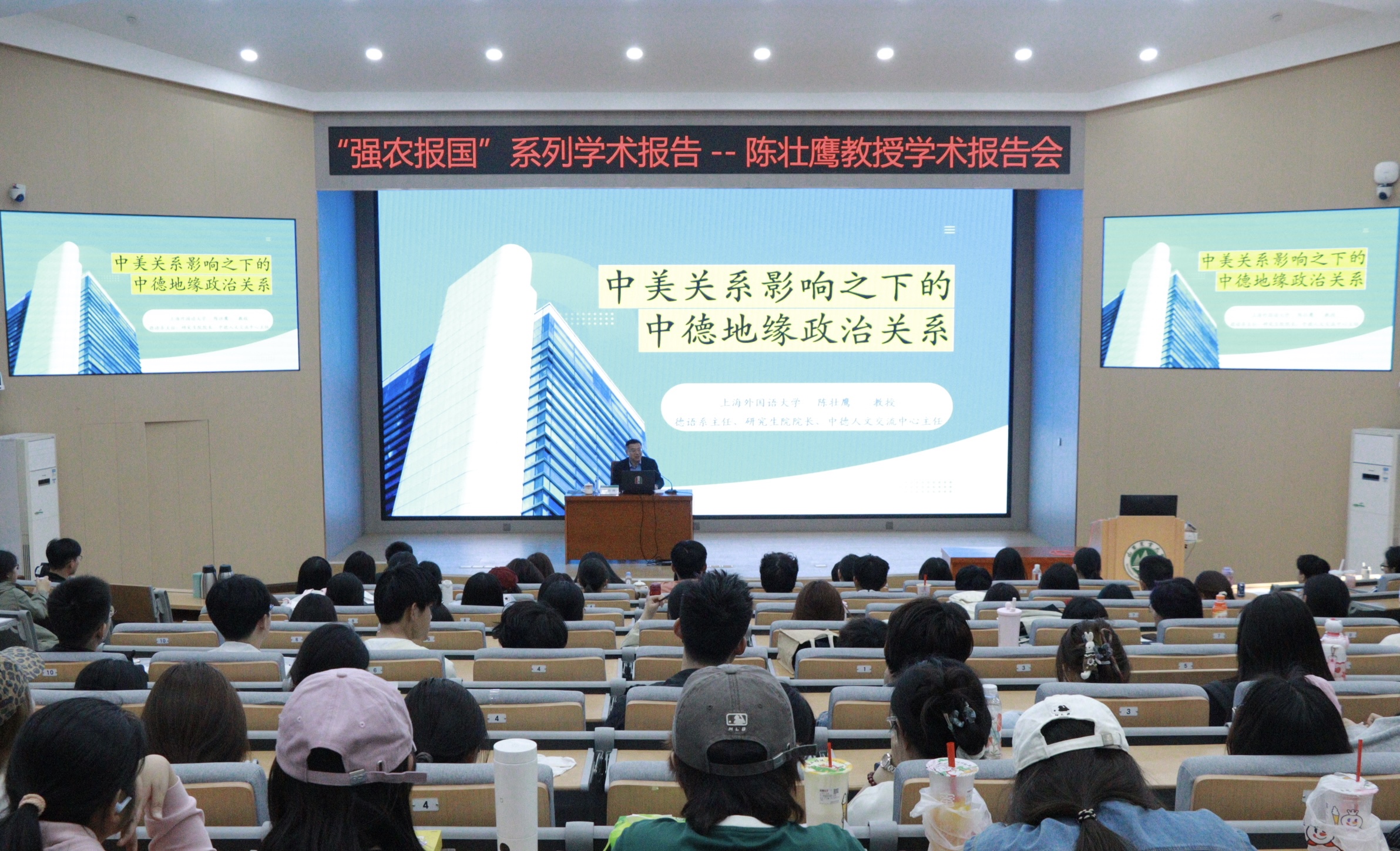 报告会上,陈壮鹰教授用通俗易懂的语言,向同学们讲解了当前国际形势下各国间的关系,重点分析了中美关系对中德交往的影响,还解读了德国最新政策走向、中德未来合作发展方向。同时,他也结合欧盟各国的不同发展需求,讲述了我国开展国际合作的思路与策略,让同学们清晰了解国际交往的相关知识。